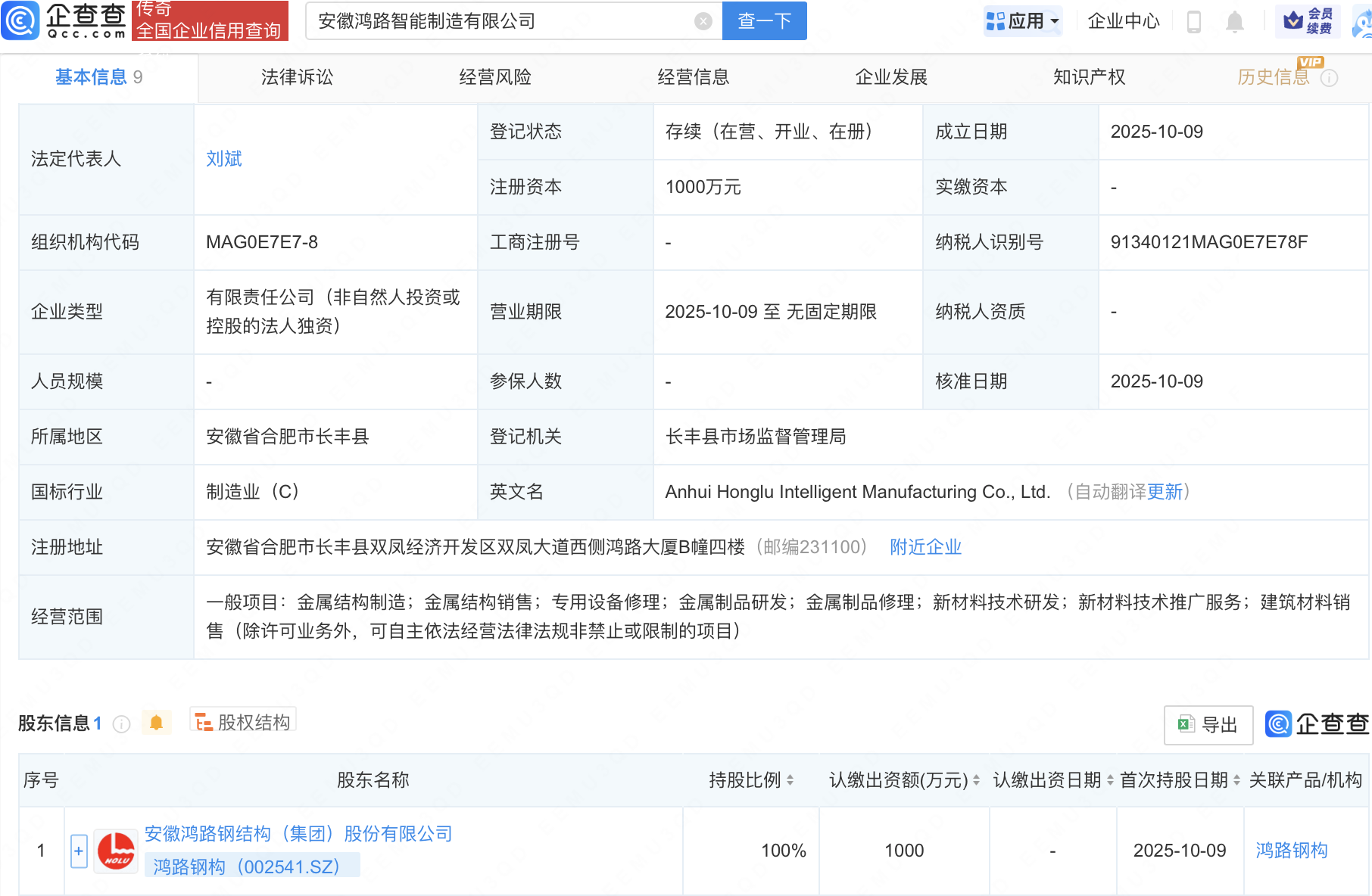近日,安徽鸿路智能制造有限公司诞生,注册成本1000万元,打算限制包含:金属结构制造;金属结构销售;专用开采修理;金属成品研发等。企查查股权穿透清晰,该公司由鸿路钢构(002541)全资抓股。