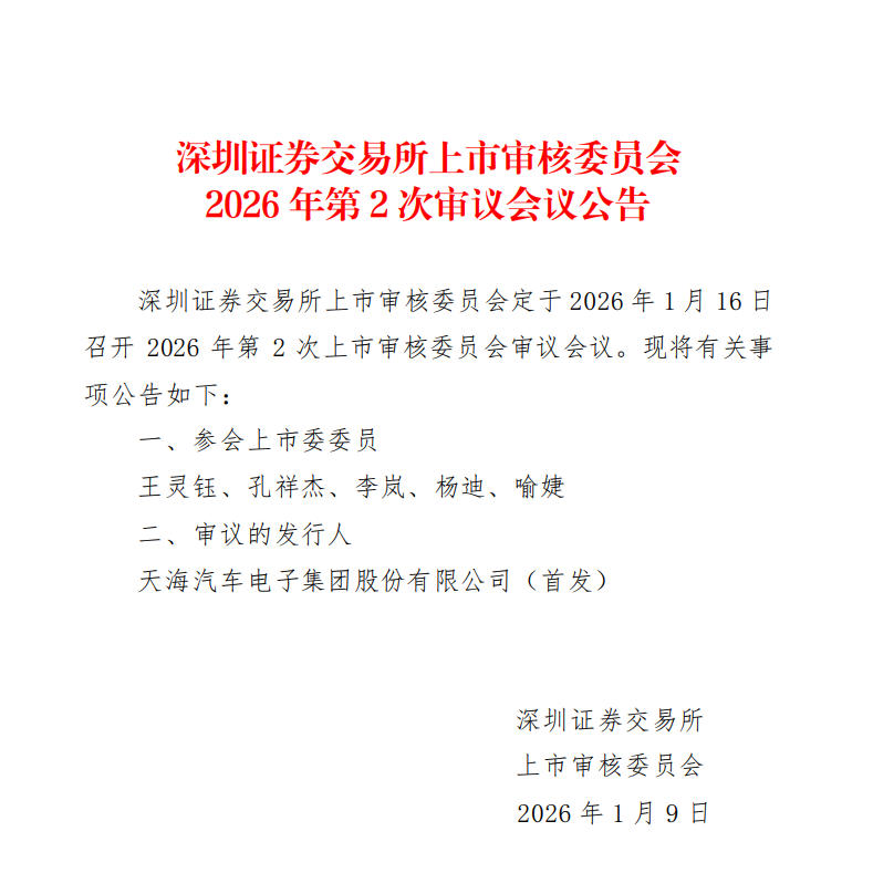 本报讯 (记者肖艳青)1月9日,深交所官网袒露,深交所上市审核委员会将于1月16日召开2026年第2次上市审核委员会审议会议开云体育(中国)官方网站,审议天海汽车电子集团股份有限公司(以下简称“天海电子”)深交所主板首发事项。