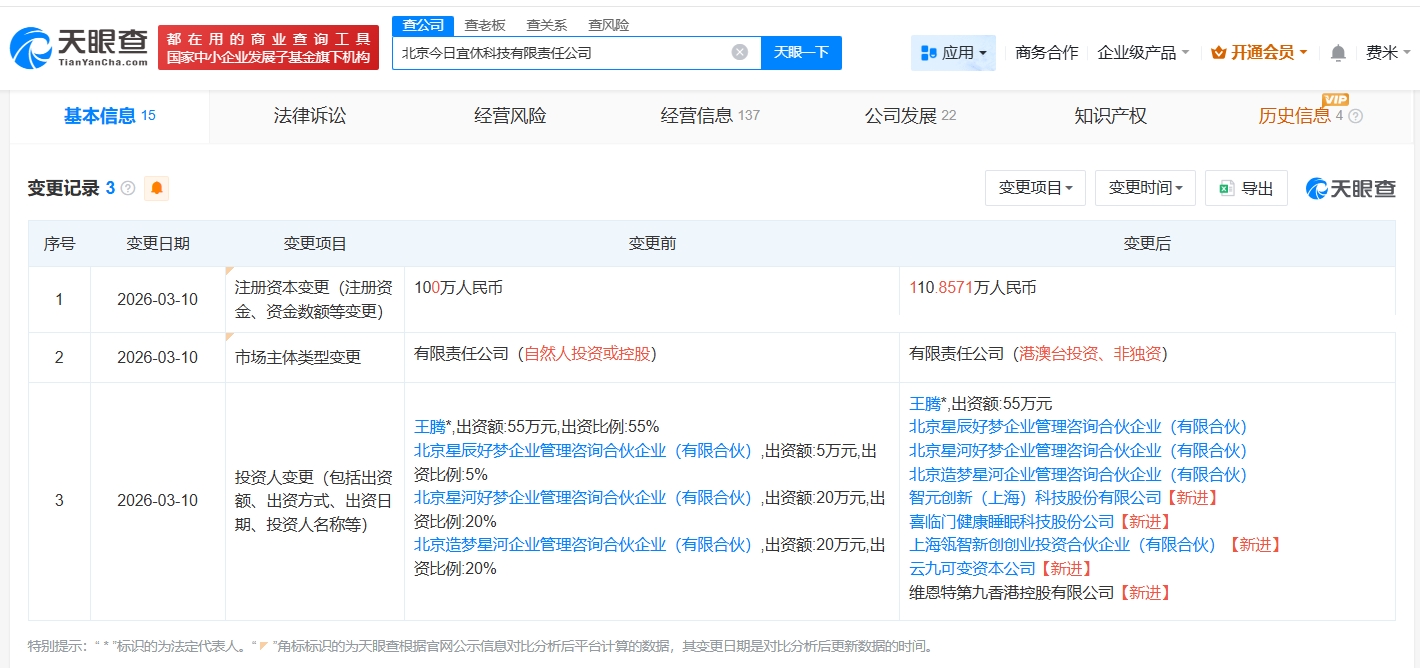 每经AI快讯,天眼查工商信息露出,近日开yun体育网,北京本日宜休科技有限包袱公司发生工商变更,新增智元机器东谈主联系公司智元调动(上海)科技股份有限公司、喜临门(603008)等为激动,注册本钱由100万元东谈主民币增至约110.9万元东谈主民币。北京本日宜休科技有限包袱公司开拓于本年1月,法定代表东谈主、董事、司理、财务庄重东谈主为王腾,策画限制含软件开发、集成电路联想、集成电路芯片联想及就业等。激动信息露出,该公司现由王腾、北京银河美梦企业贬责商榷结伙企业(有限结伙)及上述新增激动等共同抓股。