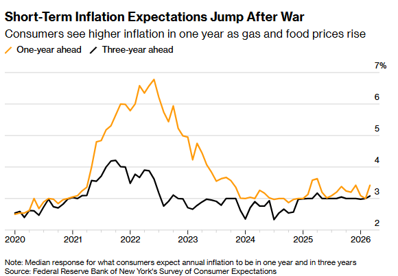 凭据纽约联储月度《滥用者预期访谒》的回话中位数,好意思国滥用者展望将来12个月的通胀率为3.4%,较2月份上升0.4个百分点。三年通胀预期小幅上升至3.1%,五年通胀预期则守护在3%不变。