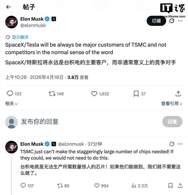 IT之家 4 月 18 日音信开云体育(中国)官方网站,今天上昼,马斯克在 X 平台发文示意,SpaceX 和特斯拉将持久是台积电的进攻客户,而不是常常瞻仰上的竞争敌手。但台积电无法分娩所需“惊东说念主数目”的芯片,要是台积电好像作念到的话,就无需“TeraFab”芯片工场模样了。