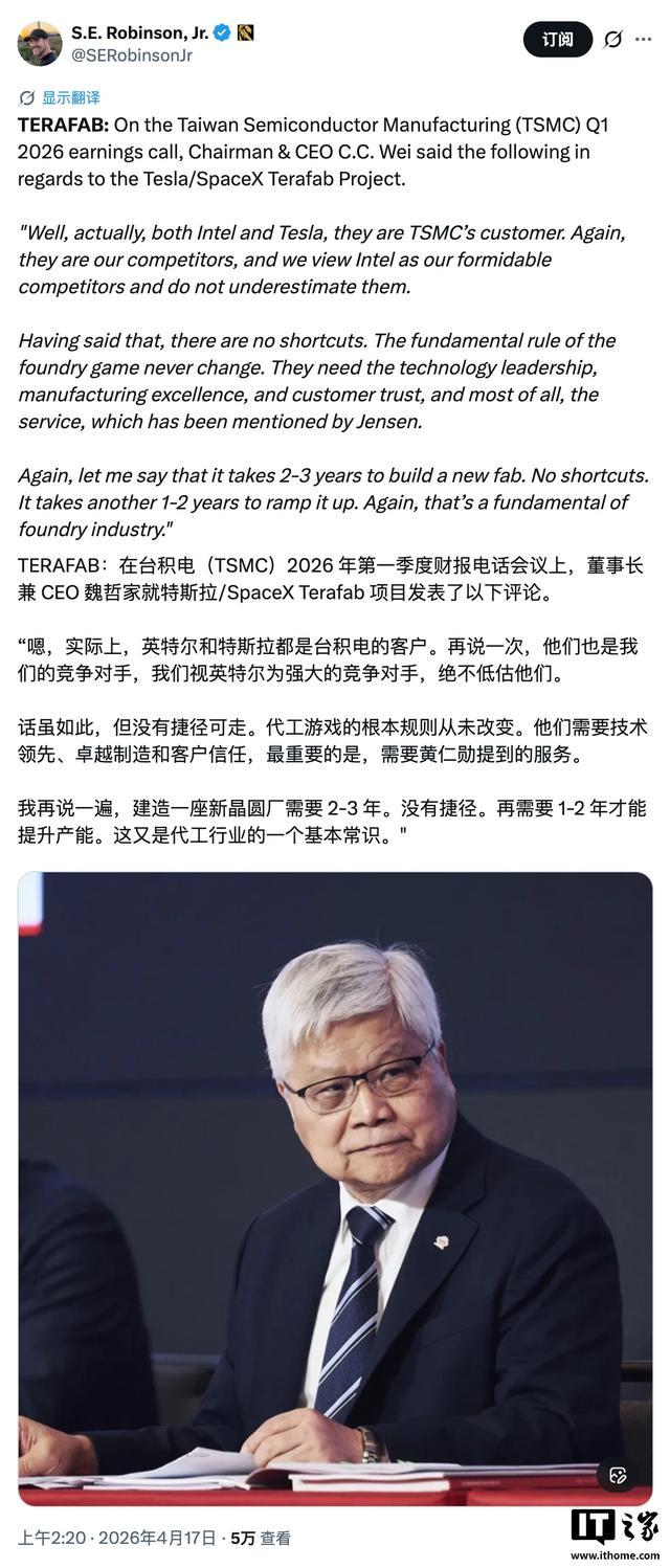 马斯克是在批驳一则帖子时作出的批驳的。这则帖子提到了台积电 CEO 魏哲家在财报电话会议上的表态。IT之家附上粗鲁如下: